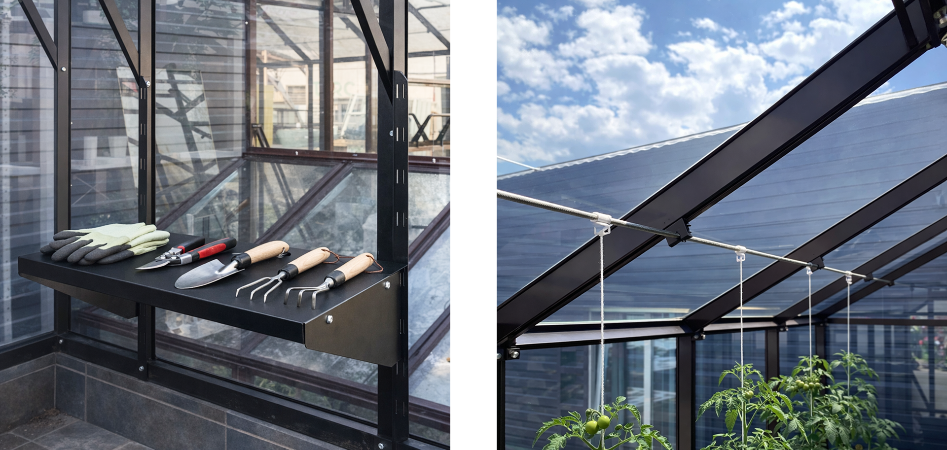 Прутковая нержавеющая система подвязывания равномерно распределяет нагрузку на каркас, что снижает риск растрескивания стекла и упрощает уход за высокорослыми культурами.